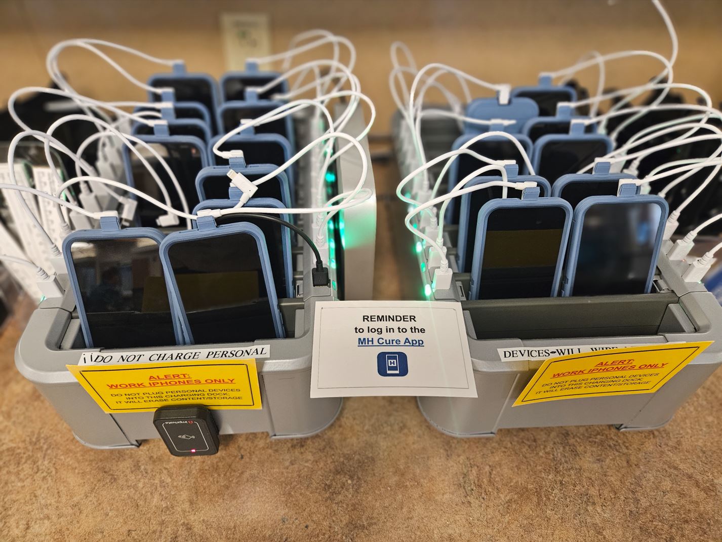 At the beginning of each shift, clinicians tap their badges to check out a phone and log into work apps.