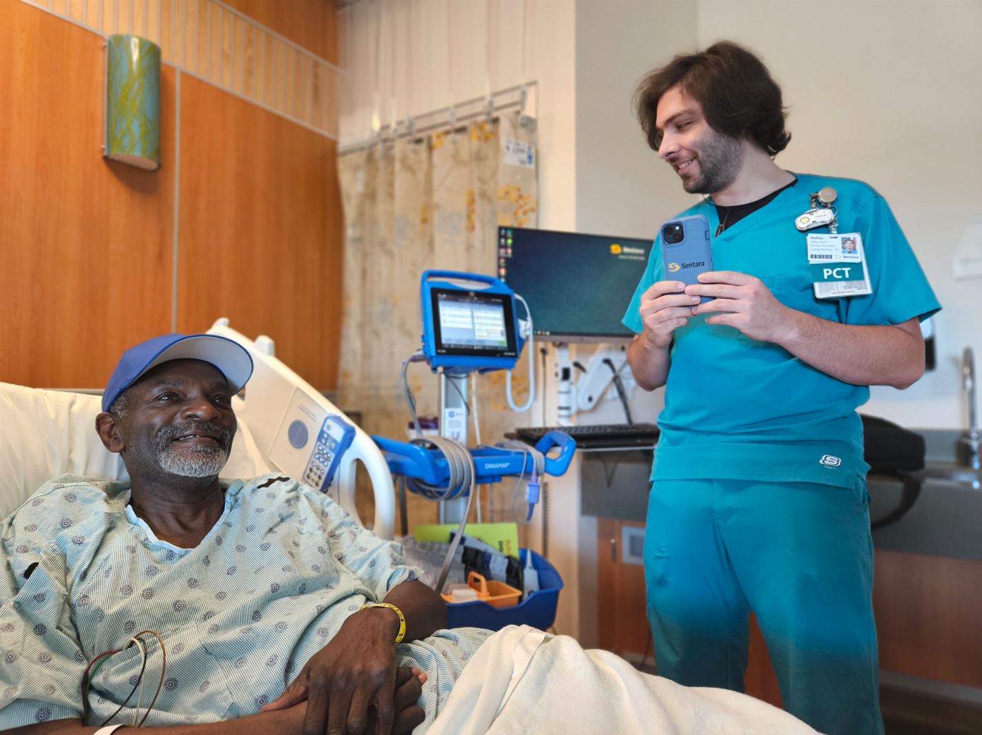 Josh Adams, patient care technician at Sentara Princess Anne Hospital, can use the phone to document vital signs, bed baths, lab draws, and important updates.